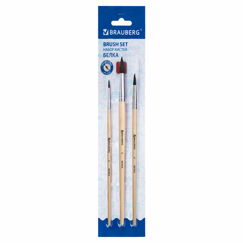 Кисти BRAUBERG, набор 3 шт. (беличья круглая № 2, 4, 6), блистер, 200216