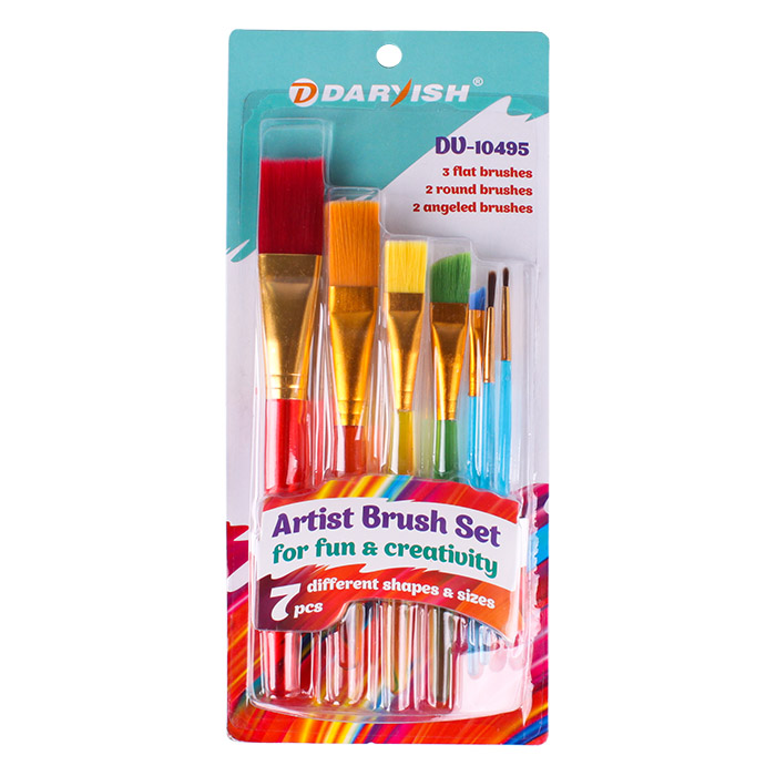 В набор входят 7 кистей: 3плоские, 2скошенные,2круглые. Предназначены для художественных и декоративно-оформительных работ. Изготовлены из синтетического ворса, материал ручки -пластмасса, металл, Подходят для работы с любыми ыидами красок, хорошо держат форму.