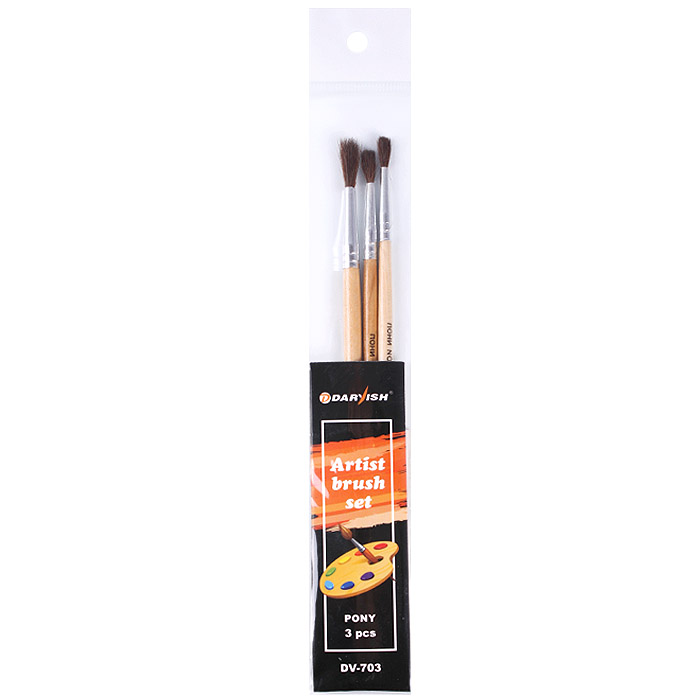 Кисти набор 3шт/уп "Darvish" (пони №2,3,4) . Упаковка с европодвесом 22,5*3,8см Основной инструмент художника - кисти для рисования. Как и в любом другом занятии, от качества инструмента во многом зависит и конечный результат. С хорошими кистями работать - одно удовольствие, они помогают быстро и легко воспроизводить задуманное художником изображение на холсте и бумаге. Разные кисти отличаются по материалу, который использовался для ихизготовления, а также форме и размеру.