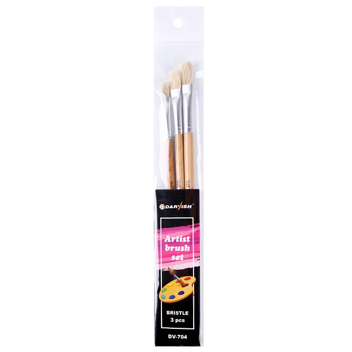 Кисти набор 3шт/уп "Darvish" (щетина №4, 6, 8) Упаковка с европодвесом 23,5*3,8см Основной инструмент художника - кисти для рисования. Как и в любом другом занятии, от качества инструмента во многом зависит и конечный результат. С хорошими кистями работать - одно удовольствие, они помогают быстро и легко воспроизводить задуманное художником изображение на холсте и бумаге. Разные кисти отличаются по материалу, который использовался для ихизготовления, а также форме и размеру.