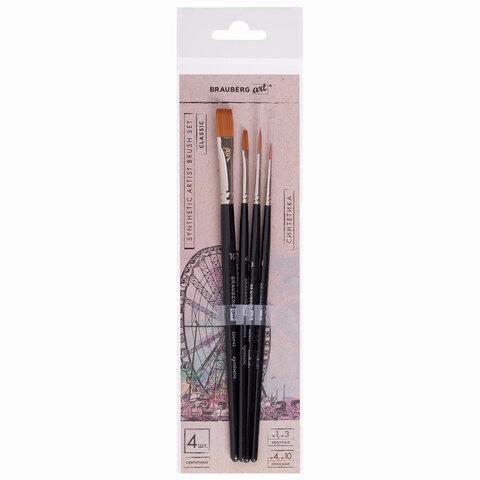 Кисти художественные BRAUBERG ART, набор 4 штуки, синтетика, (круглые № 1, 3, плоские № 4, 10), 200943