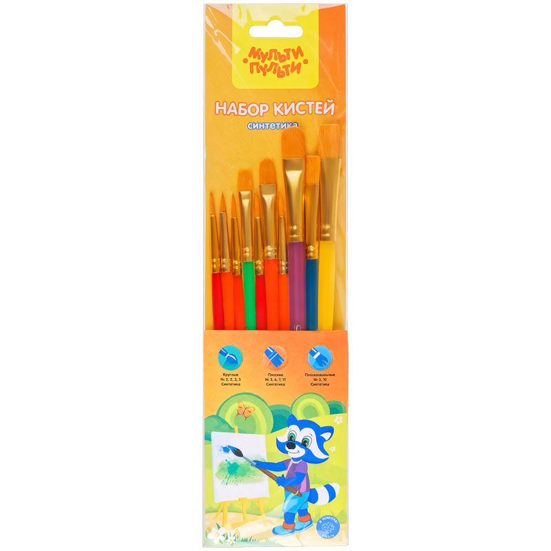 Набор кистей Мульти-Пульти 10шт., синтетика, №: 2 , 3 круглые, № 3, 6, 7, 12 плоские, № 10, 3 плоскоовальные, пакет, европодвес