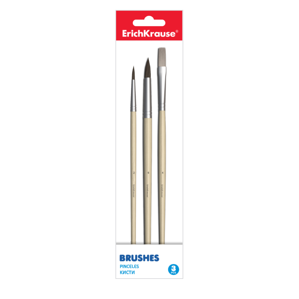 Кисти ErichKrause® Basic для акварели и гуаши, пони и щетина, 3 штуки, в полибеге