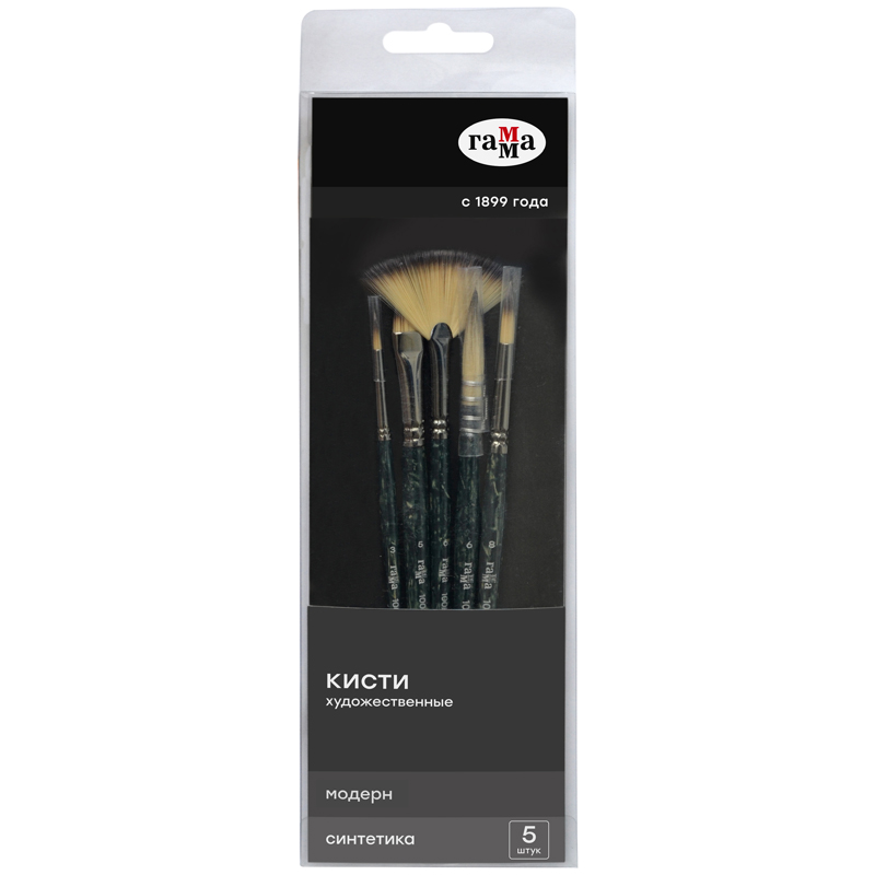 Набор художественных кистей синтетика Гамма "Модерн", 5шт., круглые №3,8, веерная № 6, плоская скошенная №5, круглая №6 французское крепление, блистер