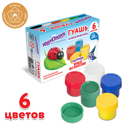Гуашь ЮНЛАНДИЯ "ЮНЫЙ ВОЛШЕБНИК", 6 цветов по 20 мл, высшее качество, без кисти, картонная упаковка, 191331
