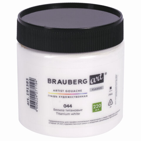 Гуашь художественная 1 шт., BRAUBERG ART CLASSIC, баночка 220 мл, БЕЛИЛА ТИТАНОВЫЕ, 191583
