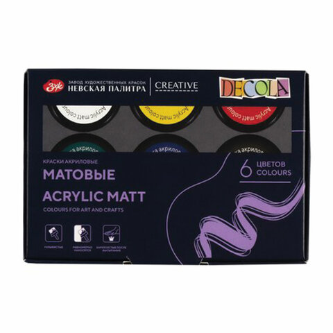 Матовые краски "Декола" на основе водной акриловой дисперсии легко наносятся на любую поверхность: бумагу, картон, грунтованный холст, дерево, металл, кожу и др. Обладают высокой укрывистостью, хорошо смешиваются, быстро высыхают. После высыхания приобретают матовую поверхность, не смываются водой. Могут быть использованы для росписи специализированных поверхностей, таких как ткань, кожа, пластик, металл, стекло или керамика.При работе с впитывающими и цветными поверхностями (например, деревом) перед нанесением красочного слоя рекомендуется предварительно загрунтовать изделие белым акриловым грунтом в 1-3 слоя с промежуточной сушкой.Храните краски плотно закрытыми. Кисти и инструменты сразу после работы промойте водой.Акриловые краски высокого качества идеально подойдут как для начинающих художников, так и для профессионалов своего дела.