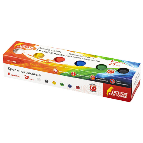 Краски акриловые для рисования и хобби ОСТРОВ СОКРОВИЩ 6 цветов по 25 мл, 191688