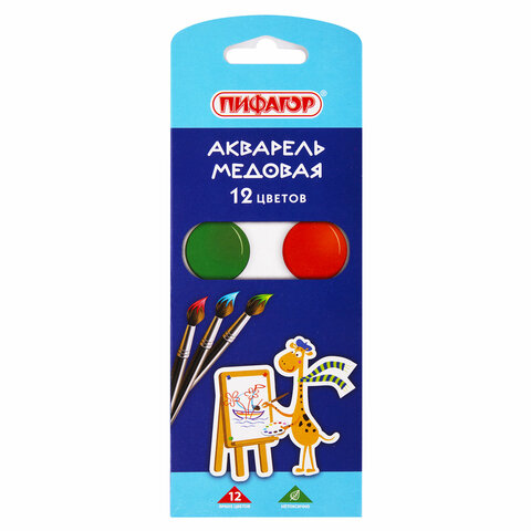 Краски акварельные ПИФАГОР "ЖИРАФ" на коррексе, 12 цветов, медовые, круглые кюветы, 192647