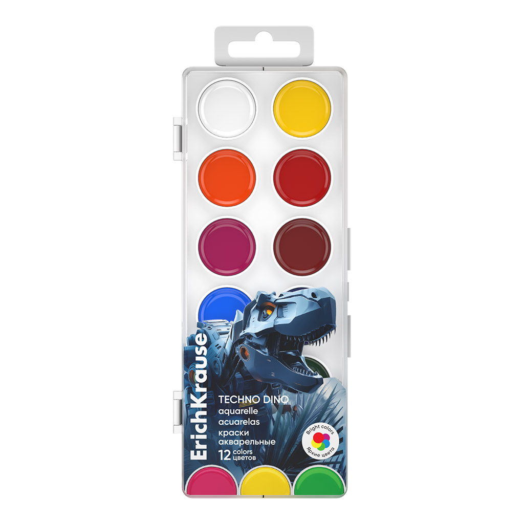 Краски акварельные ErichKrause Techno Dino 12 цветов (в пластиковой коробке с европодвесом)