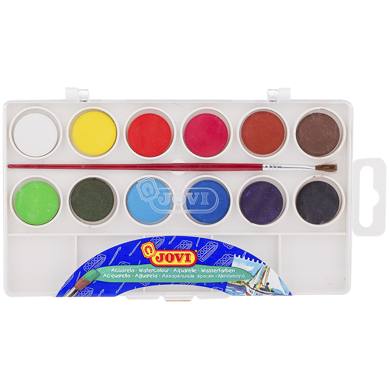 Высококачественная акварель для рисования дома, в школе, в художественных студиях, подходит для разных техник рисования. 12 базовых цветов. Краски в коробке с кюветами для воды и кистью. Спрессованные таблетки диаметром 22 мм (вес 2,9 г) с высоким содержанием пигмента. Гораздо более экономичные, чем полусухая акварель в кюветах. Легко разводятся: при добавлении небольшого количества воды цвета получаются очень насыщенными и яркими, а увеличение количества воды приводит к эффектам, типичным для техники акварели. Хорошо ложатся на поверхность. Могут использоваться для рисования на различных поверхностях: бумаге различной плотности, картоне, для раскрашивания просохших фигурок из пасты для лепки, застывающей на воздухе, или из папье-маше. Краски отстирываются с большинства видов тканей. Страна производства Испания.