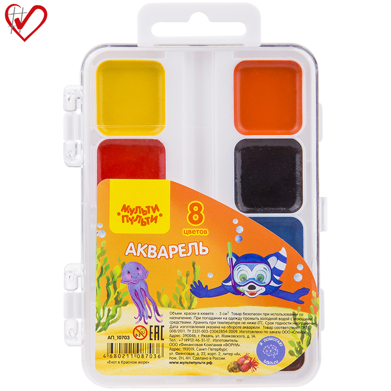 Акварель Мульти-Пульти "Енот в Красном море", медовая, 08 цветов, без кисти, пластик, европодвес