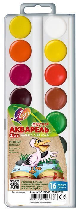 Краски акварельные «Zoo» медовые полусухие изготовлены на основе органических пигментов и натурального связующего с добавлением пчелиного мёда. Краски акварельные «Zoo» в пластмассовой упаковке имеют увеличенные по объему кюветы с краской наиболее часто используемых цветов, выпускаютсянаборами 6 и 12 цветов. Краски акварельные серии ZOO в картонной коробке выпускаются наборами 6, 12, 14 цветов с кистью и без кисти.