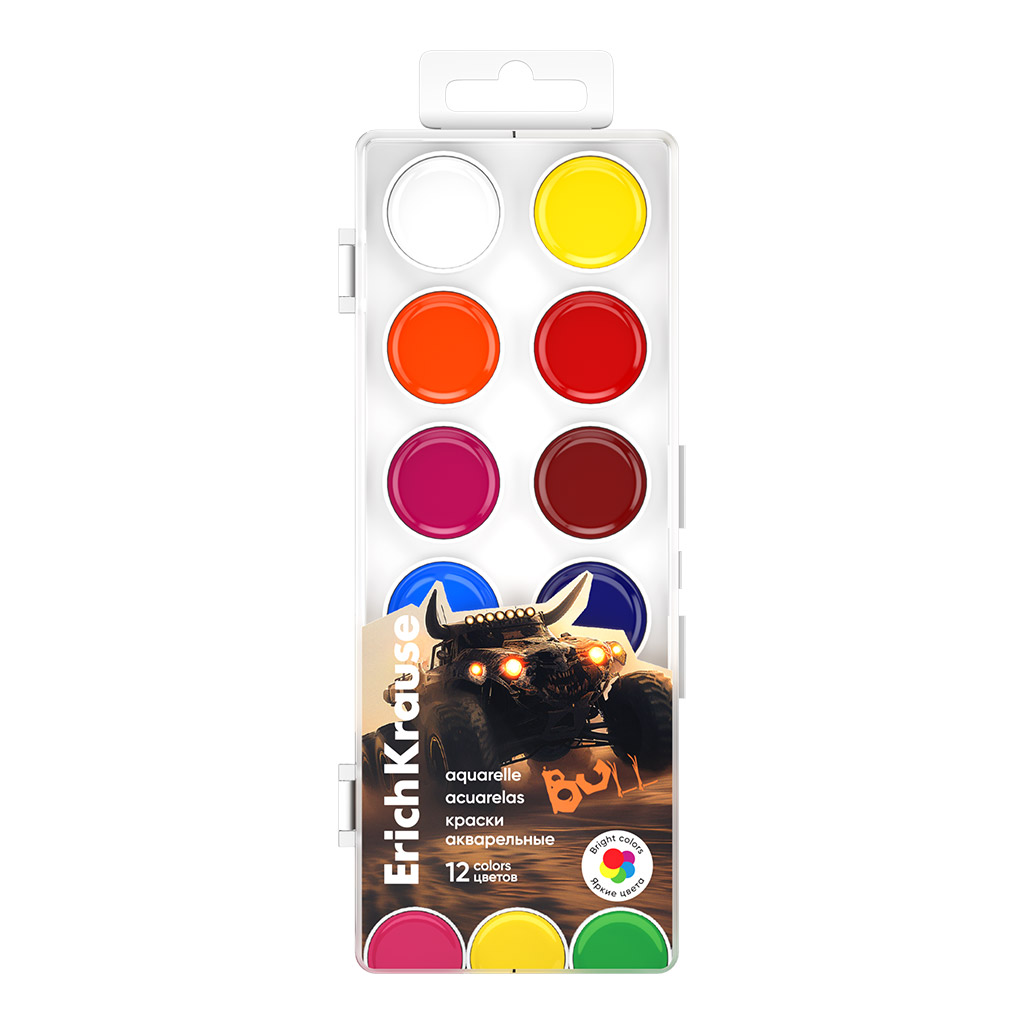 Краски акварельные ErichKrause Road Beast 12 цветов (в пластиковой коробке с европодвесом)