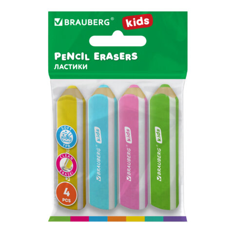 Ластики фигурные BRAUBERG KIDS "Карандашики", НАБОР 4 ШТУКИ, пакет, 271996