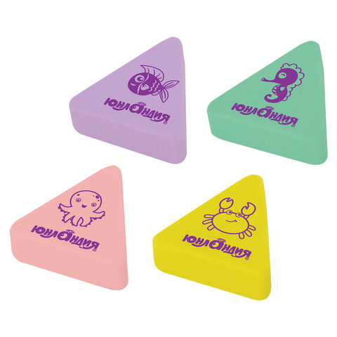 Ластик ЮНЛАНДИЯ "Морские обитатели" предназначен для удаления надписей, сделанных чернографитным карандашом. Имеет треугольную форму в поставляется в четырех цветах ассорти с рисунками морских обитателей. Ластик обеспечит лёгкое и чистое стирание без повреждения поверхности бумаги и без образования бумажной пыли. Размер - 27х27х9 мм. Поставляется в картонном дисплее.