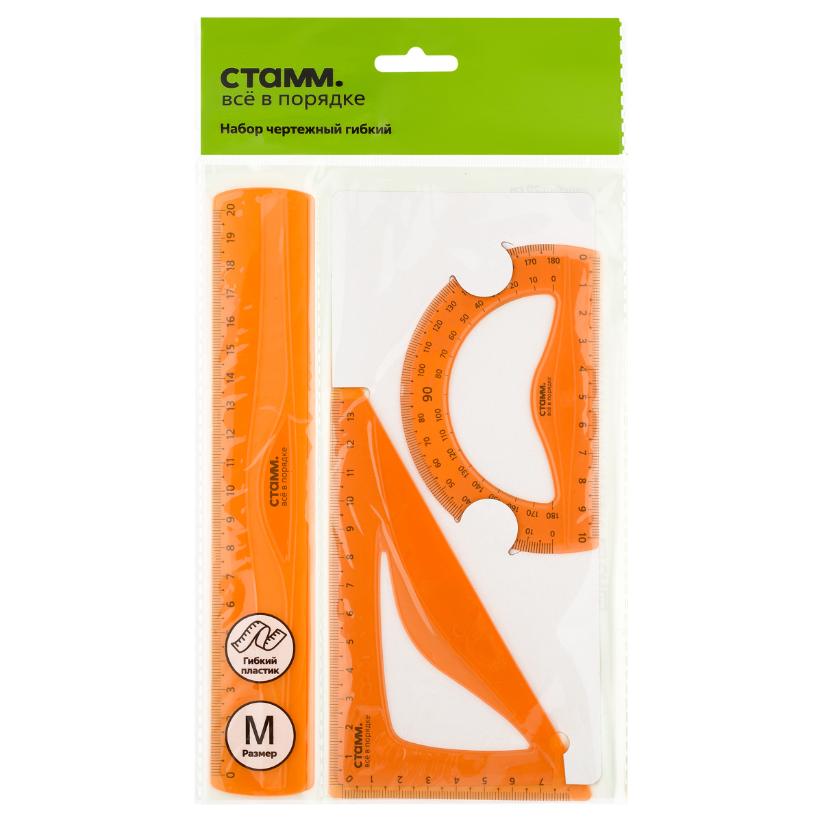 Набор чертежный СТАММ, размер M (линейка 20см, треугольник, транспортир), гибкий, прозрачный, оранжевый, европодвес