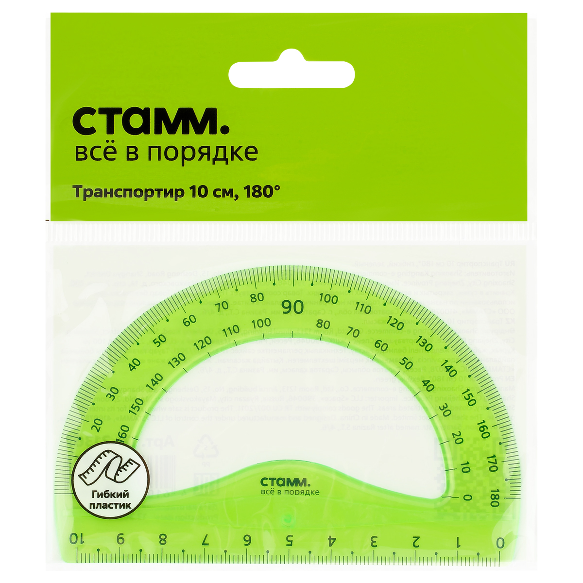 Транспортир 10см, 180° СТАММ, пластиковый, гибкий, прозрачный, зеленый, европодвес