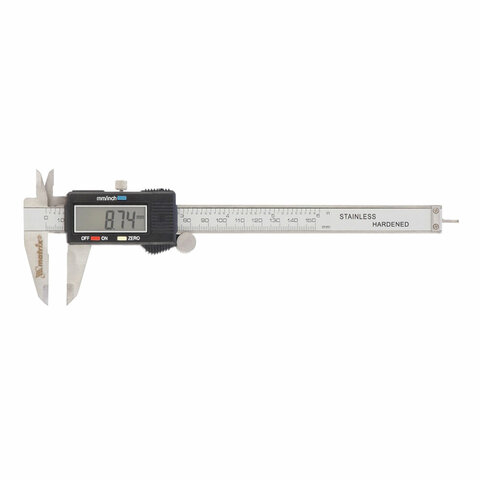 Электронный штангенциркуль со шкалой 150 мм предназначен для определения внутренних и наружных размеров различных предметов, а также глубин отверстий и канавок. Цифровой инструмент позволяет проводить точные замеры, т.к. его погрешность составляет ±0,02 мм при измерении размеров до 100 мм, и ±0,03 мм — свыше 100 мм. Результаты отображаются на жидкокристаллическом дисплее, поэтому считывание показаний происходит легко и быстро. Штангенциркуль пригодится на производстве, в слесарной или столярной мастерской, а также дома или в гараже. Преимущества: - изготовлен из инструментальной нержавеющей стали прочен и устойчив к коррозии, поэтому прослужит долго; - конструкцией предусмотрен глубиномер, расширяющий возможности применения измерительного инструмента; - батарею типа SR44 1,5 В, от которой питается инструмент, легко заменить, и штангенциркуль с глубиномером снова будет готов к работе; - надежно закрывающийся пластмассовый футляр с мягкой подложкой предотвратит поломку инструмента в случае падения или удара.