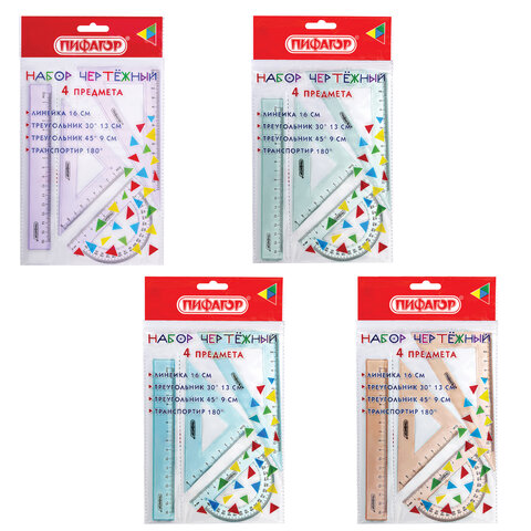 Набор чертежный геометрический ПИФАГОР предназначен для выполнения чертежных работ. В набор входят:- линейка со шкалой 16 см;- угольник с углами 30°/60° и шкалой 13 см;- угольник с углами 45°/45° и шкалой 9 см;- транспортир 180° и шкалой 10 см.Изготовлен из прочного прозрачного пластика. Цвета - пастельные ассорти, без возможности выбора. Поставляется в цветном пакете с европодвесом.