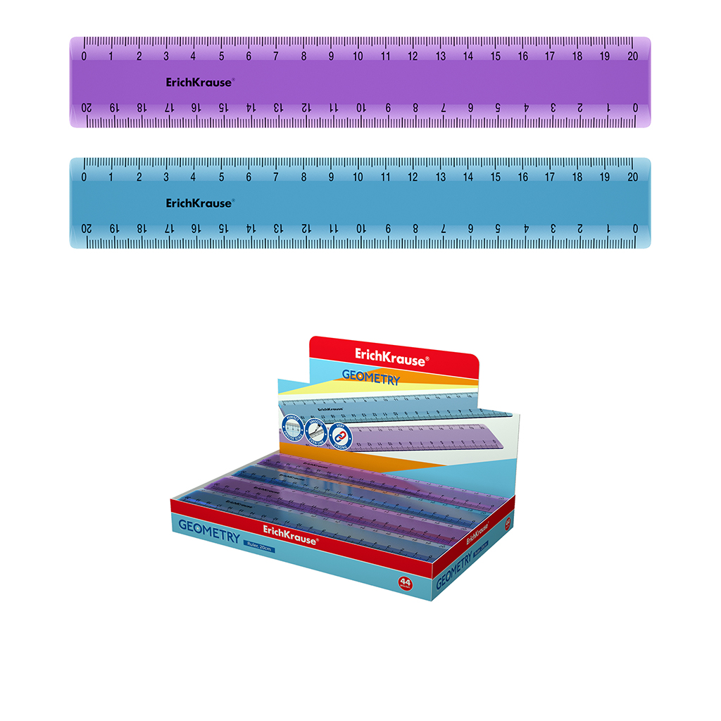 Линейка пластиковая Erich Krause Standard, 20см, ассорти из 2 цветов, в коробке-дисплее