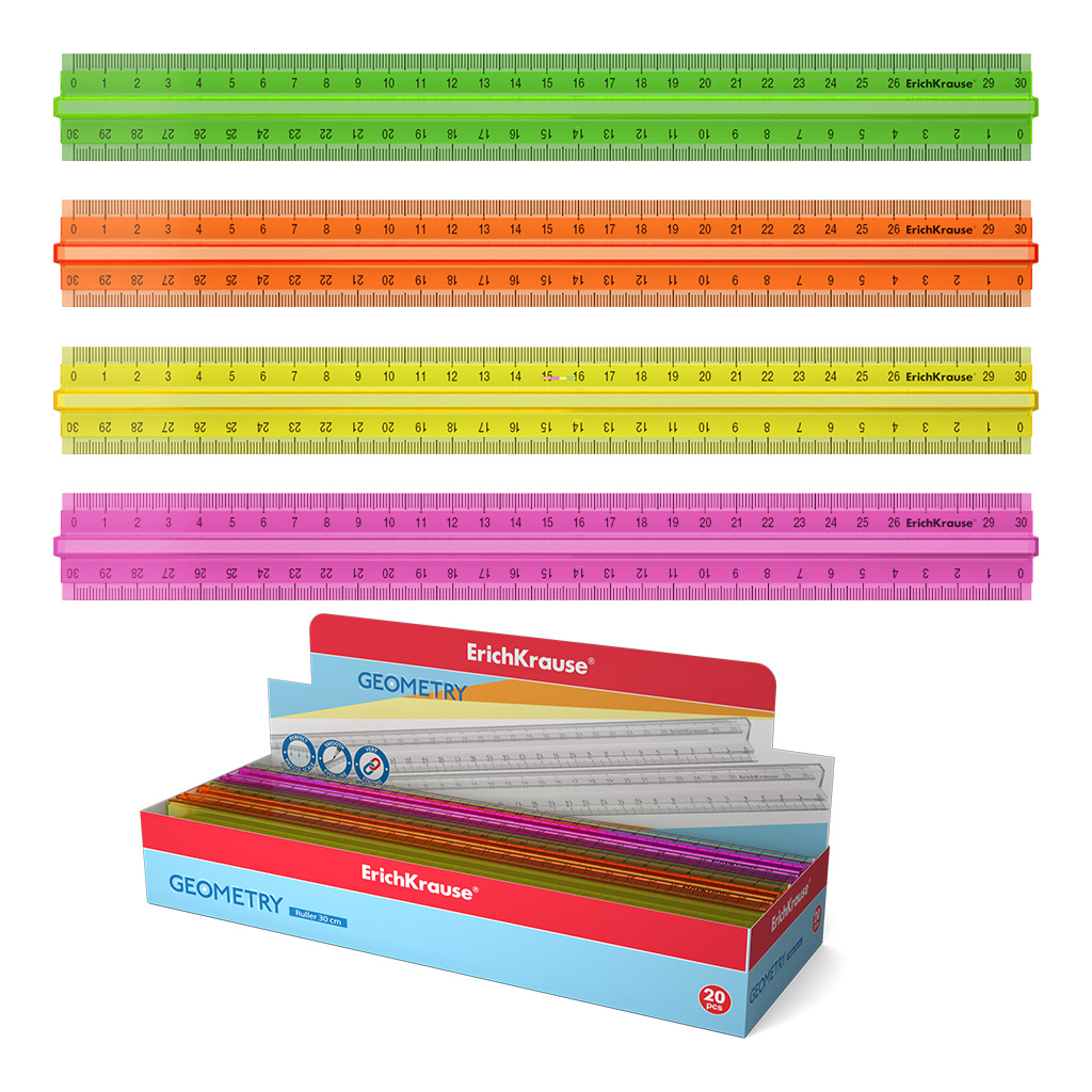 Линейка с держателем пластиковая ErichKrause® Neon, 30см, ассорти из 4 цветов, в коробке-дисплее