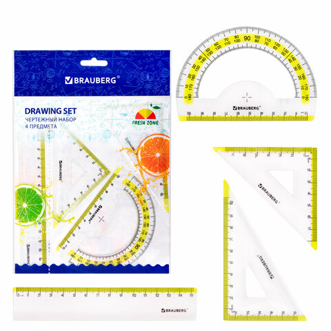 Набор чертежный BRAUBERG "FRESH ZONE" предназначен для выполнения чертежных и измерительных работ в школе и дома. Набор чертежный BRAUBERG "FRESH ZONE" изготовлен из прочного прозрачного пластика со шкалой желтого цвета. Поставляется в пластиковом пакете с европодвесом.Состав набора:- линейка со шкалой 15 см;- транспортир 180° 10 см;- треугольник 30° 10 см;- треугольник 45° 8 см.