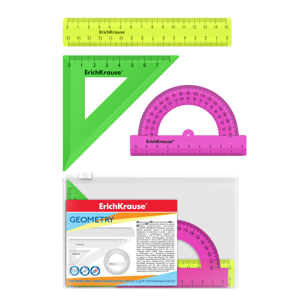 Набор геометрический малый пластиковый ErichKrause® Neon Solid, (линейка, угольник, транспортир), ассорти из 3 цветов, в zip-пакете