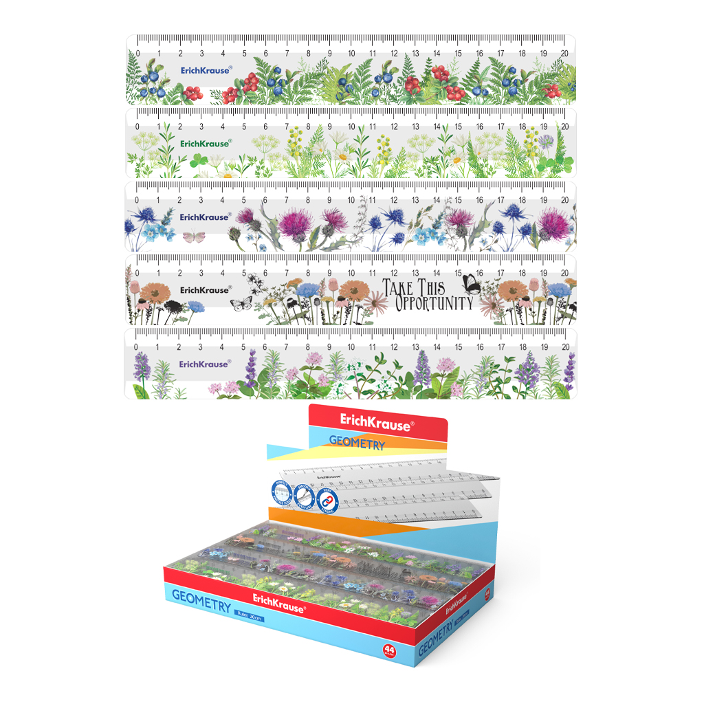 Линейка пластиковая ErichKrause®, 20см, ассорти из 5 дизайнов, в коробке-дисплее (summer)