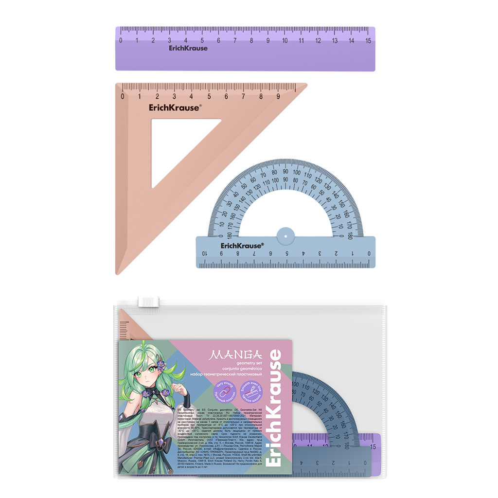 Набор геометрический малый пластиковый Erich Krause Manga, (линейка, угольник, транспортир), ассорти (в пакете по 20 штук)