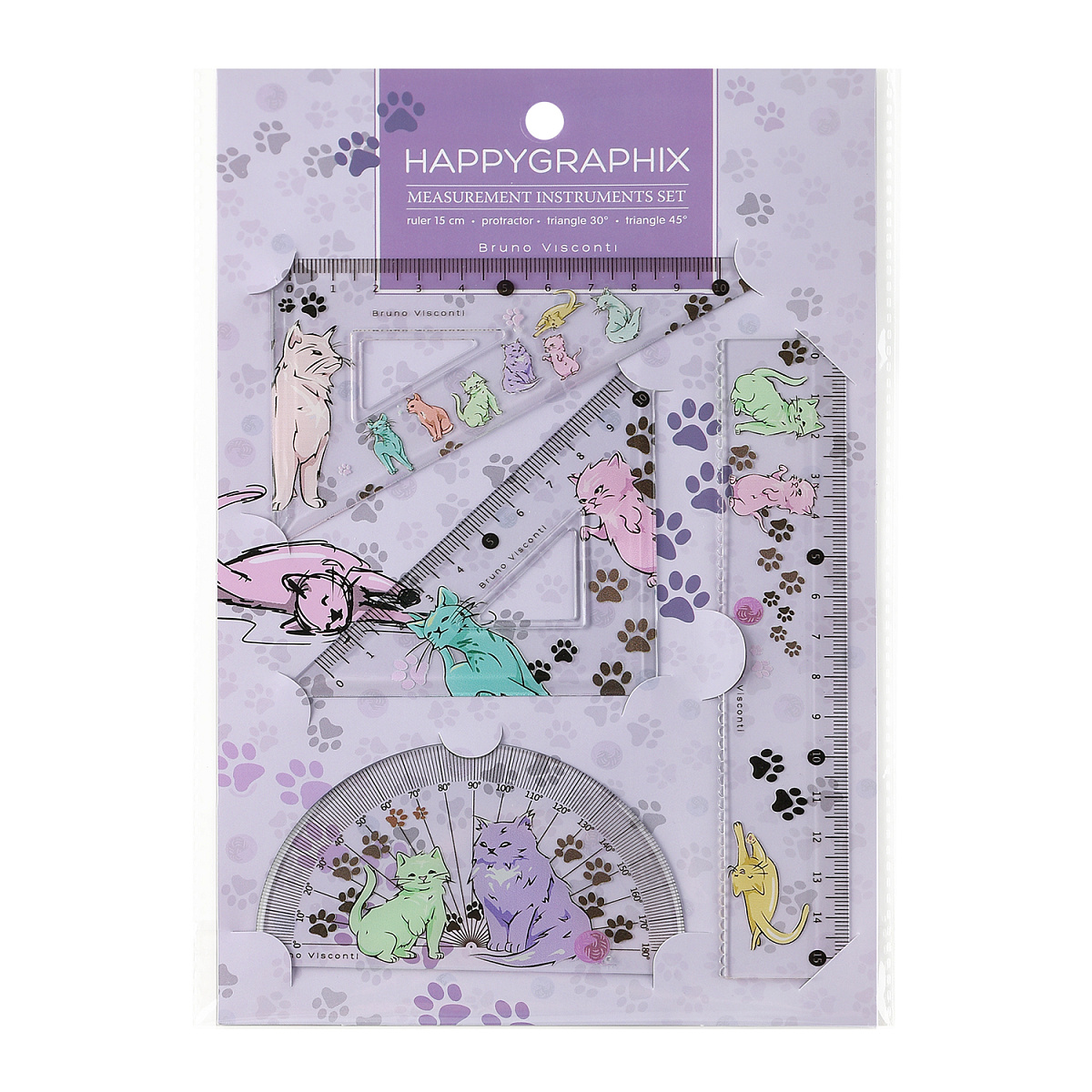 НАБОР ИЗМЕРИТЕЛЬНЫХ ИНСТРУМЕНТОВ (транспортир, линейка, два треугольника) "HappyGraphix. Котики"