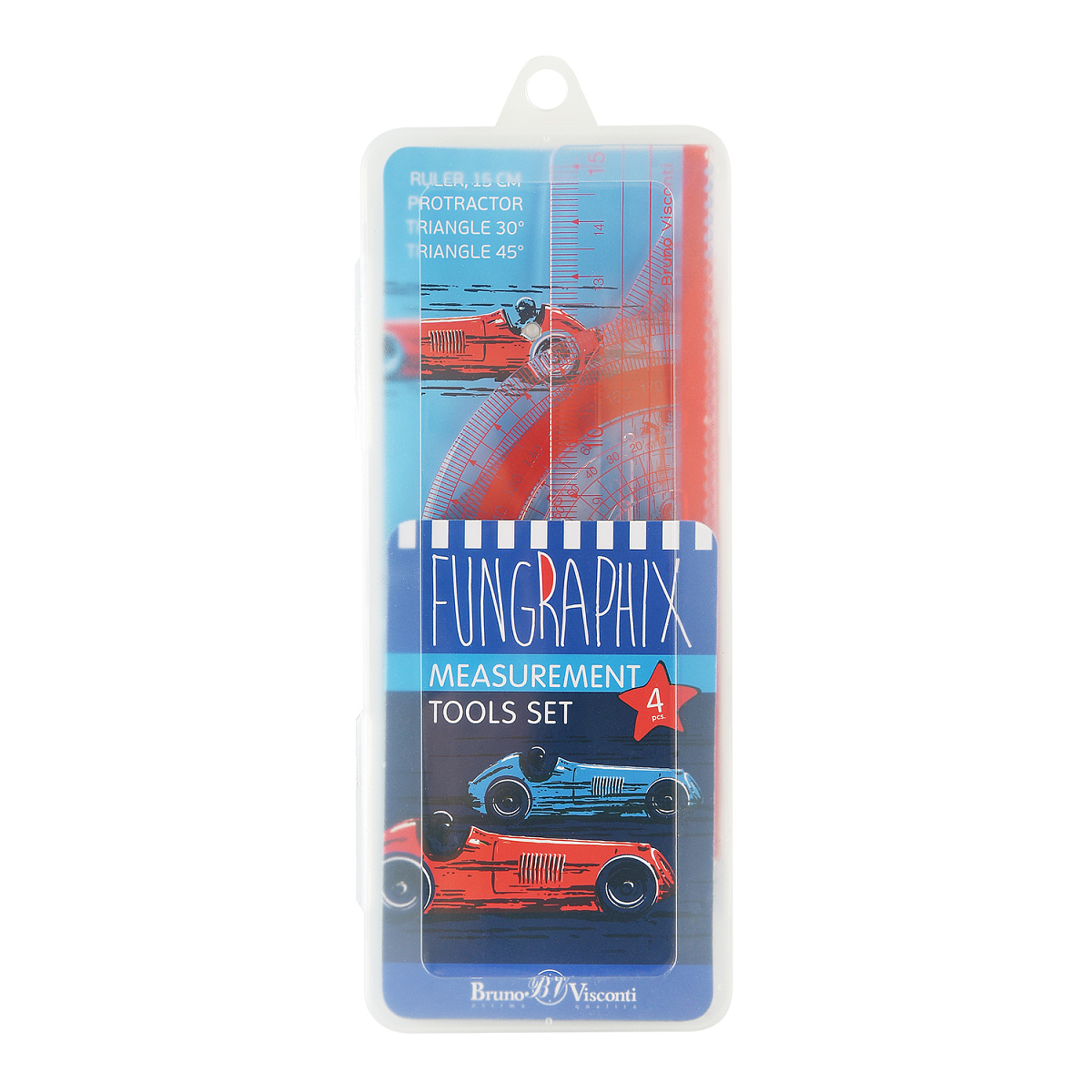 Такие забавные принты не могут не поднять настроение, их так и хочется изучать детально. Яркий набор "CARS" ТМ Bruno Visconti из 4-х металлических измерительных инструментов в пластиковом пенале: линейка 15 см, прямоугольный треугольник 30°/10 см, равнобедренный треугольник 45°/10 см, транспортир 180° в пластиковом футляре. Набор предназначен для измерения расстояний, построения углов и черчения. Разве можно не порадовать ребенка подобным набором? Учеба должна быть в радость!