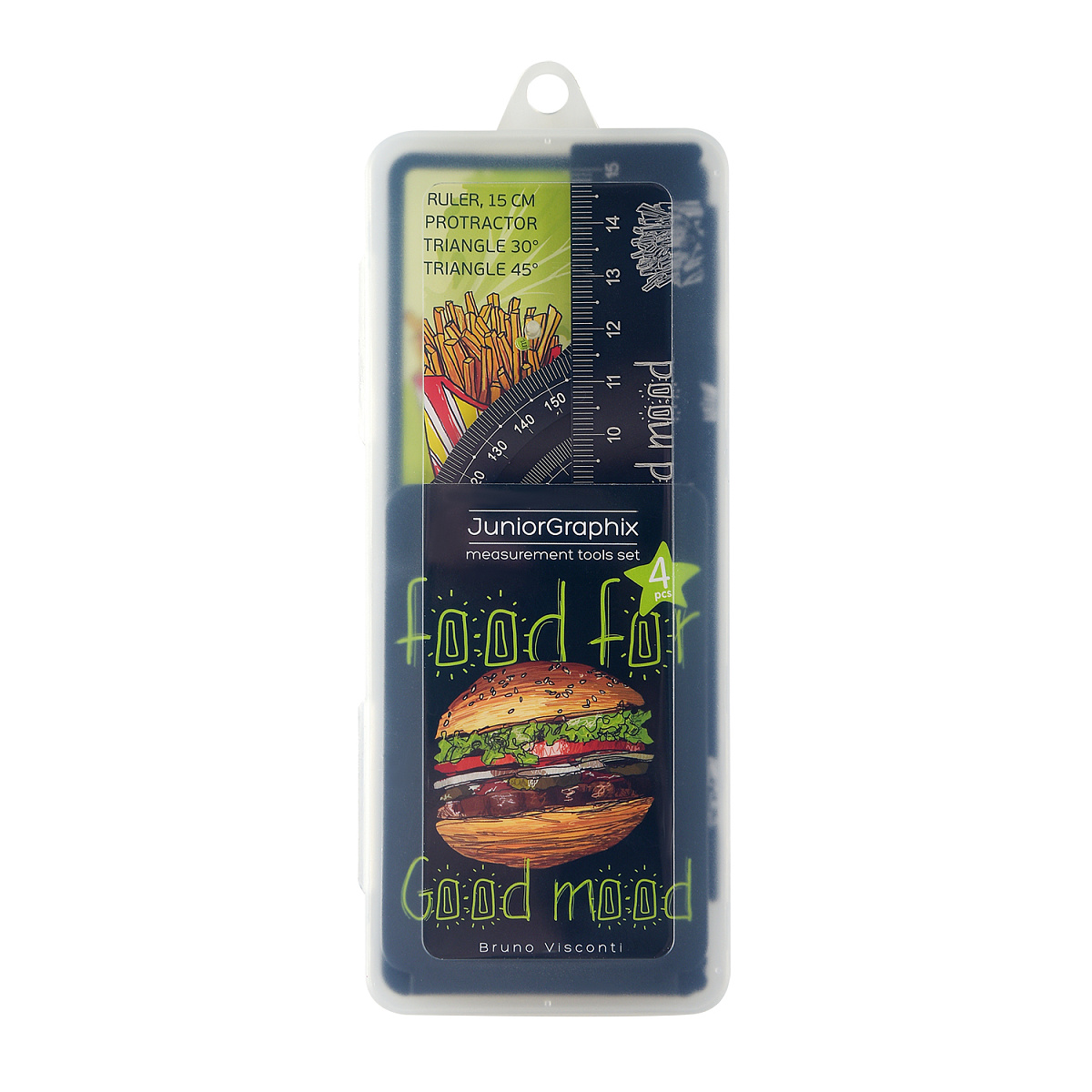 НАБОР ИЗМЕРИТЕЛЬНЫХ МЕТАЛЛИЧЕСКИХ ИНСТРУМЕНТОВ (транспортир, линейка, два треугольника)"JuniorGraphix. Гамбургер"