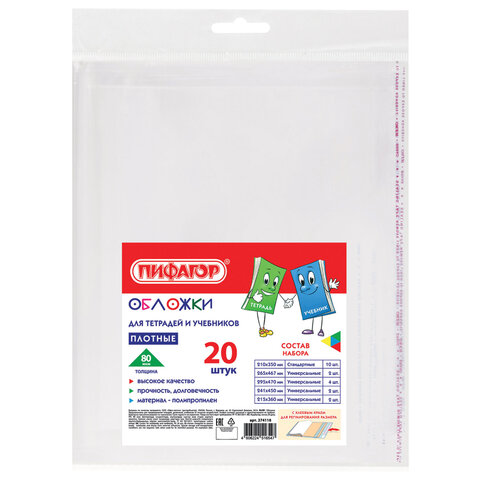 Обложки ПП для тетрадей и учебников, КЛЕЙКИЙ КРАЙ, НАБОР 20 шт., ПЛОТНЫЕ, 80 мкм, ПИФАГОР, 274118