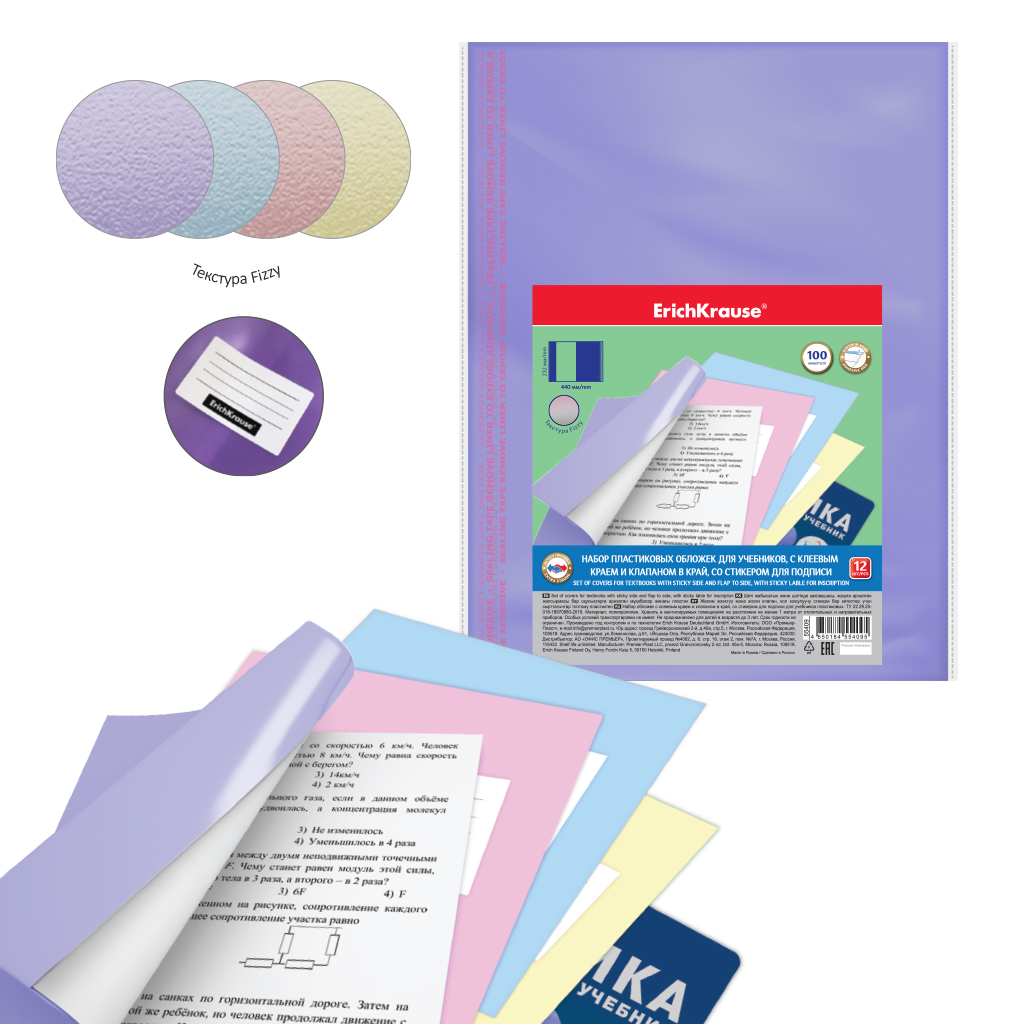 Набор пласт. обложек Erich Krause® Fizzy Pastel для учеб., с клеевым краем и клап. в край, стик. для подписи, 232х440мм, 100 мкм (пак.12 шт.)