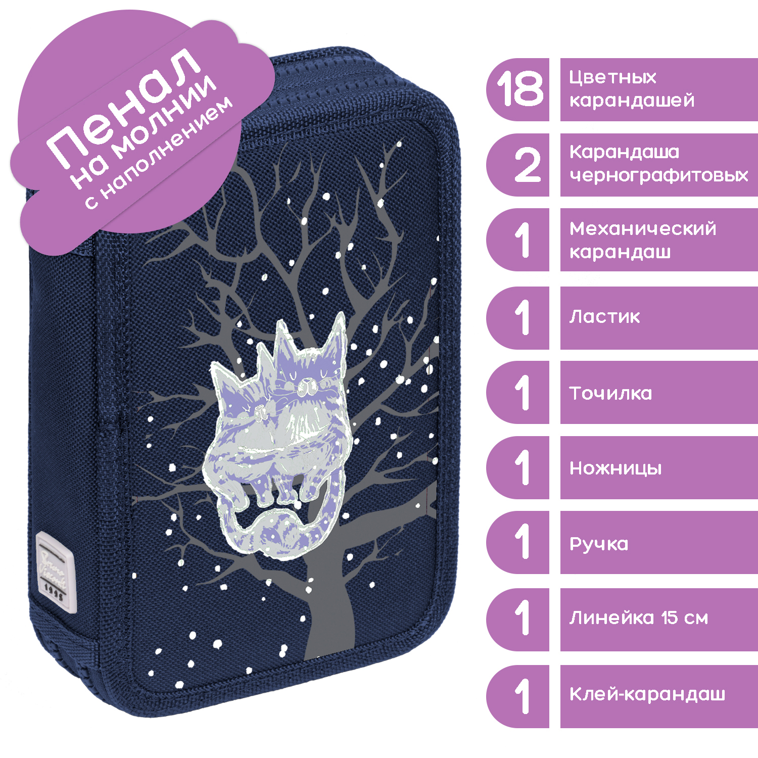 ПЕНАЛ С НАПОЛНЕНИЕМ НА МОЛНИИ, СИНИЙ "ЖИЗНЬ УДАЛАСЬ", 28 ПРЕДМЕТОВ, ДВА ОТДЕЛЕНИЯ, 200 х 130ММ