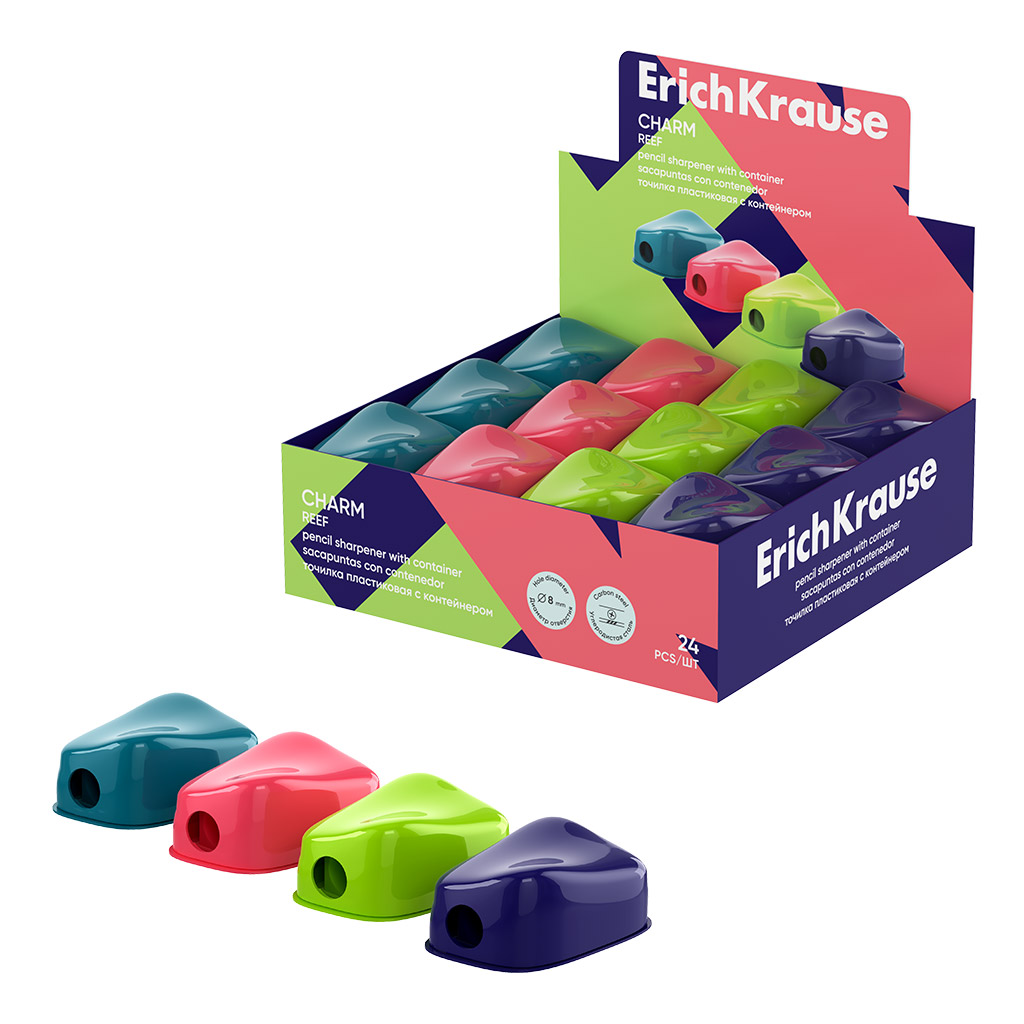 Точилка пластиковая ErichKrause Charm, Reef, с контейнером, ассорти (в коробке-дисплее по 24 штуки)