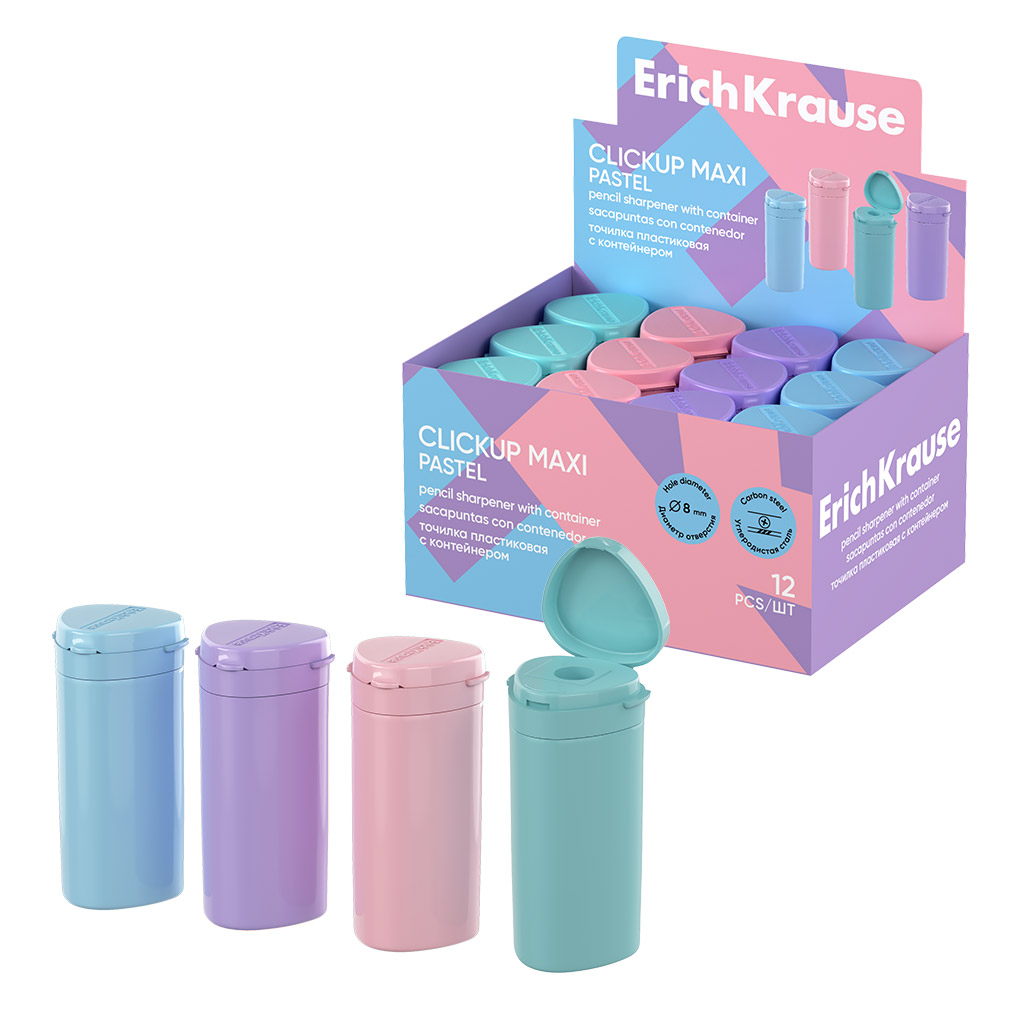 Точилка пластиковая ErichKrause ClickUp Maxi, Pastel, с контейнером, ассорти (в коробке-дисплее по 12 штук)