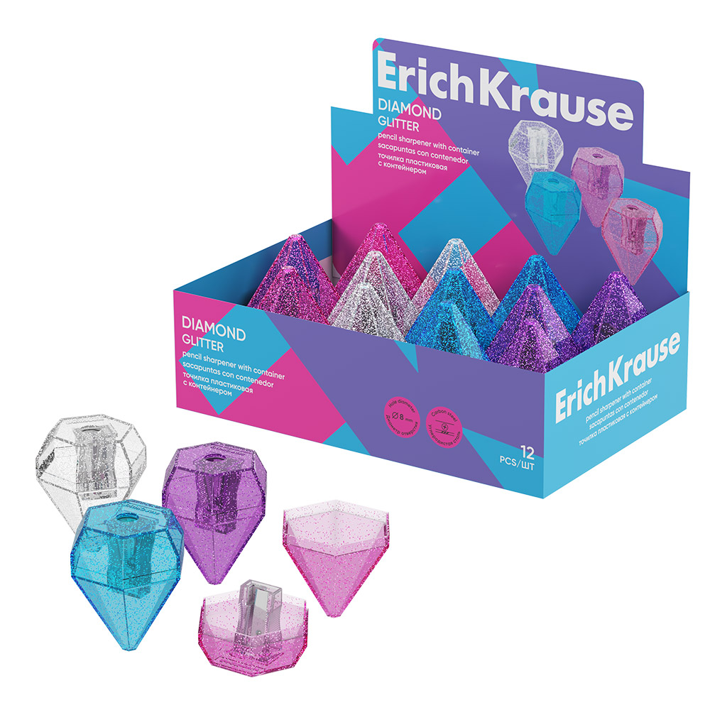 Точилка пластиковая ErichKrause Diamond, Glitter, с контейнером, ассорти (в коробке-дисплее по 12 штук)