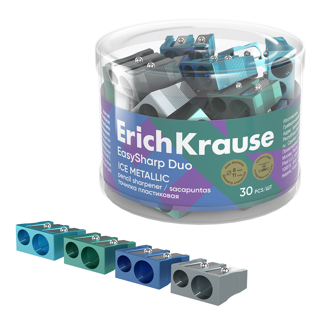 Точилка пластиковая ErichKrause EasySharp Duo, Ice Metallic, ассорти (в тубусе по 30 штук)