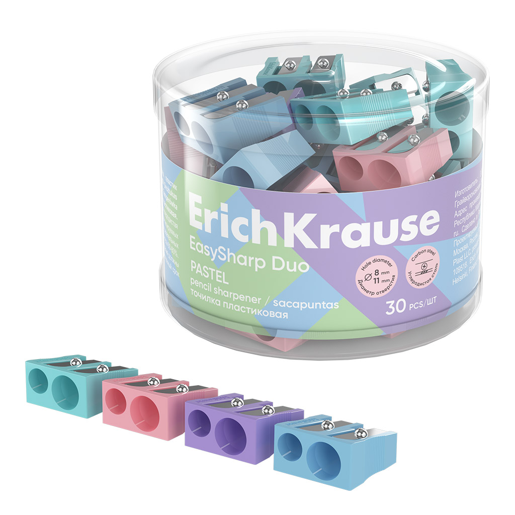 Точилка пластиковая ErichKrause EasySharp Duo, Pastel, ассорти (в тубусе по 30 штук)