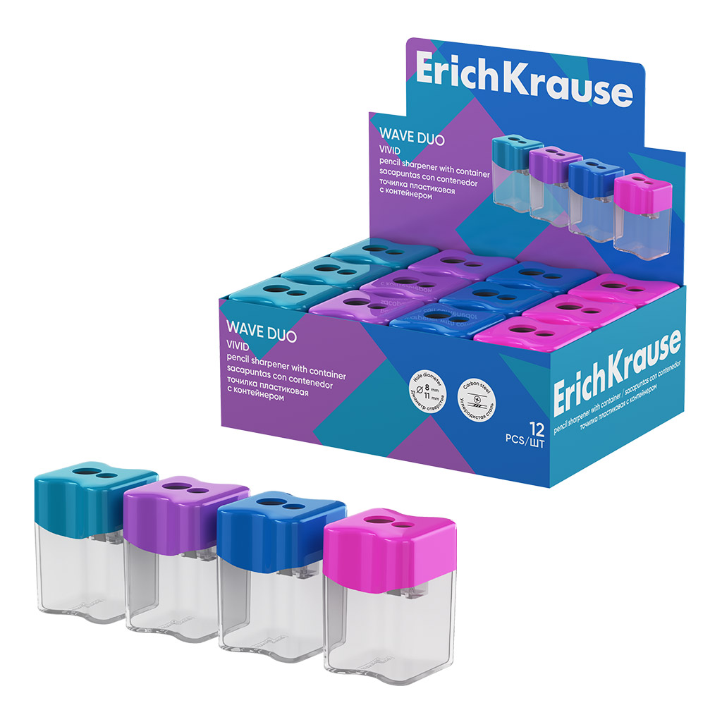 Точилка пластиковая ErichKrause Wave Duo, Vivid, с контейнером, ассорти (в коробке-дисплее по 12 штук)