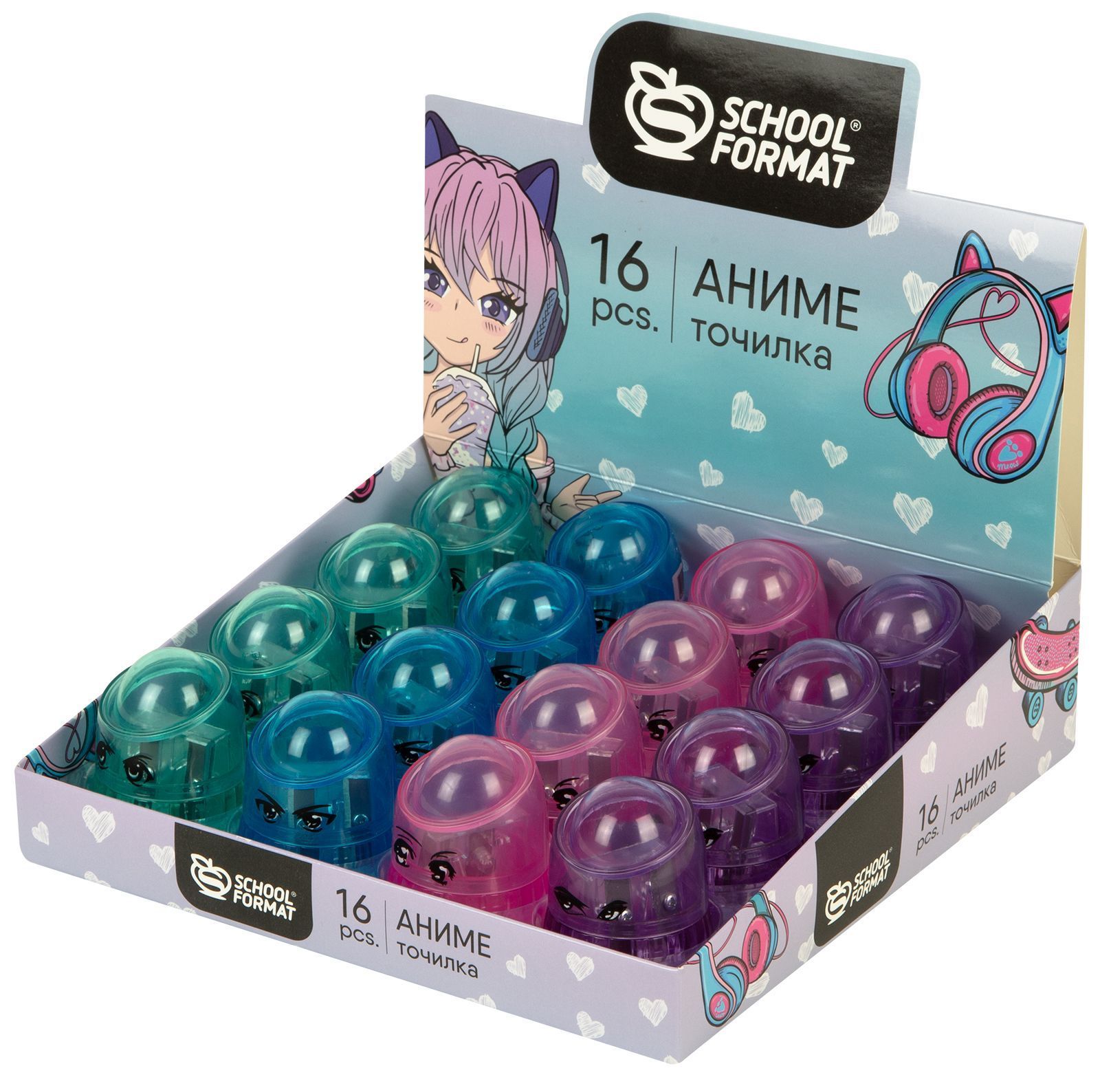 Точилка Schoolformat АНИМЕ с контейнером ассорти, корпус пластик 2 отвер. резиновые вставки в дисплее индив.штрих-код