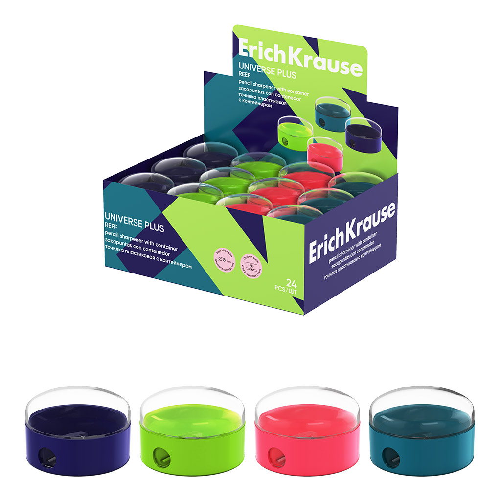 Точилка пластиковая ErichKrause Universe Plus, Reef, с контейнером, ассорти (в коробке-дисплее по 24 штуки)