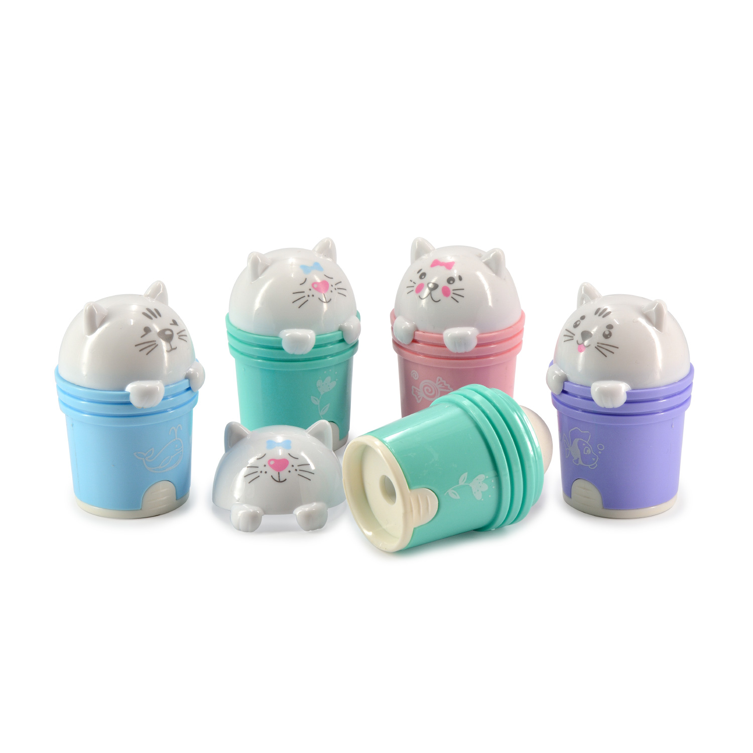 ТОЧИЛКА С КОНТЕЙНЕРОМ И ЛАСТИКОМ, 1 ОТВЕРСТИЕ "КОТЯТА" (4 ВИДА)