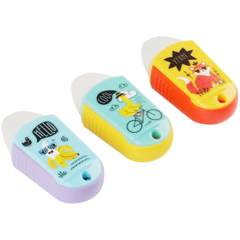 Точилка MESHU с ластиком. Небольшая и функциональная точилка с выдвижным механизмом имеет одно отверстие для заточки и ластик. На корпус нанесены милые дизайны в фирменном стиле MESHU, 3 дизайна ассорти.