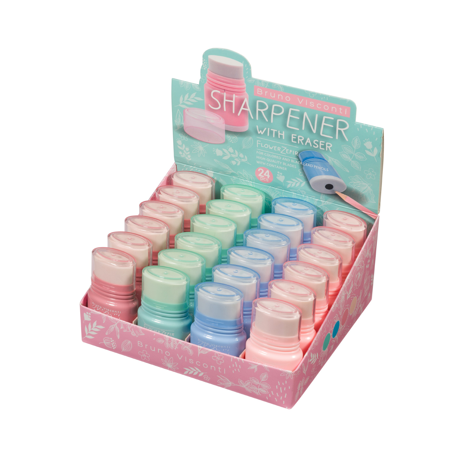 ТОЧИЛКА С КОНТЕЙНЕРОМ И ЛАСТИКОМ, 1 ОТВЕРСТИЕ "FLOWER ZEFIR" (4 ВИДА)