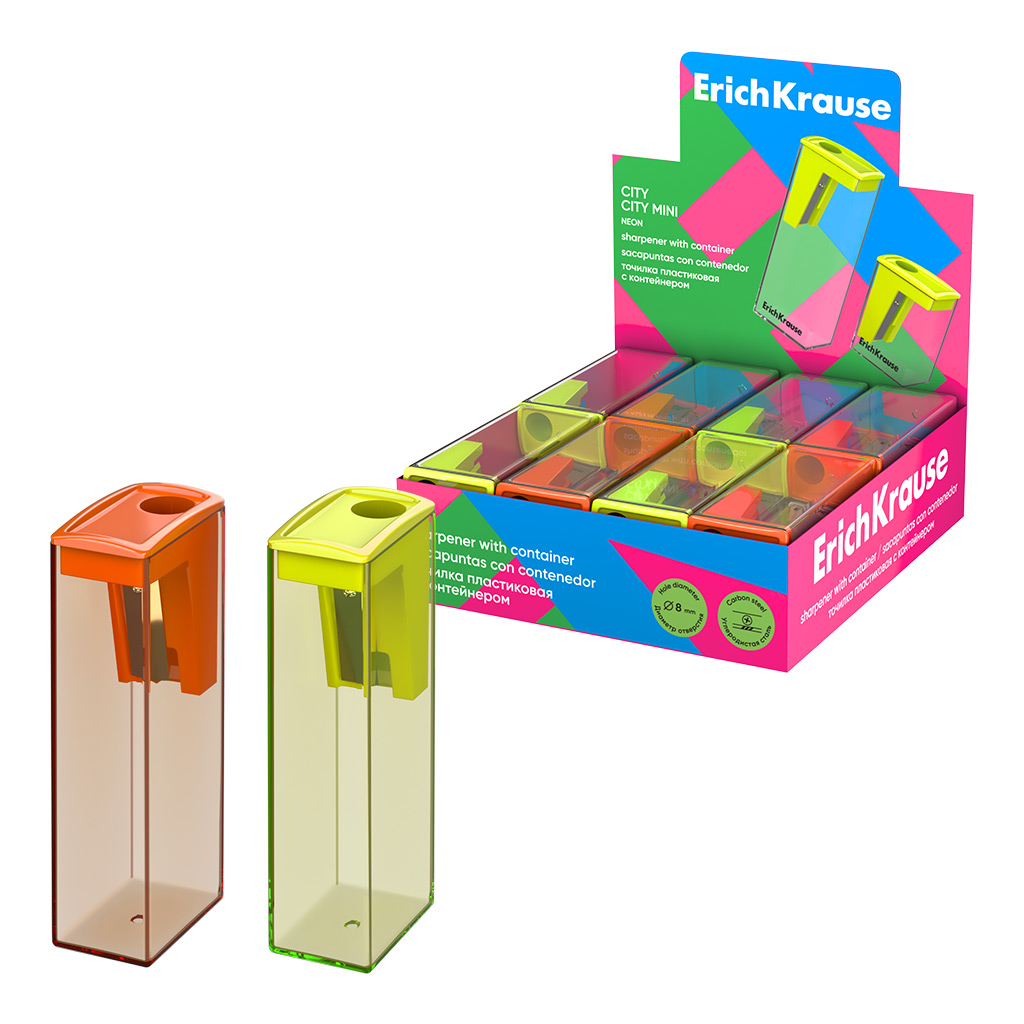 Точилка пластиковая Erich Krause City, Neon, с контейнером, ассорти (в коробке-дисплее по 16 штук)