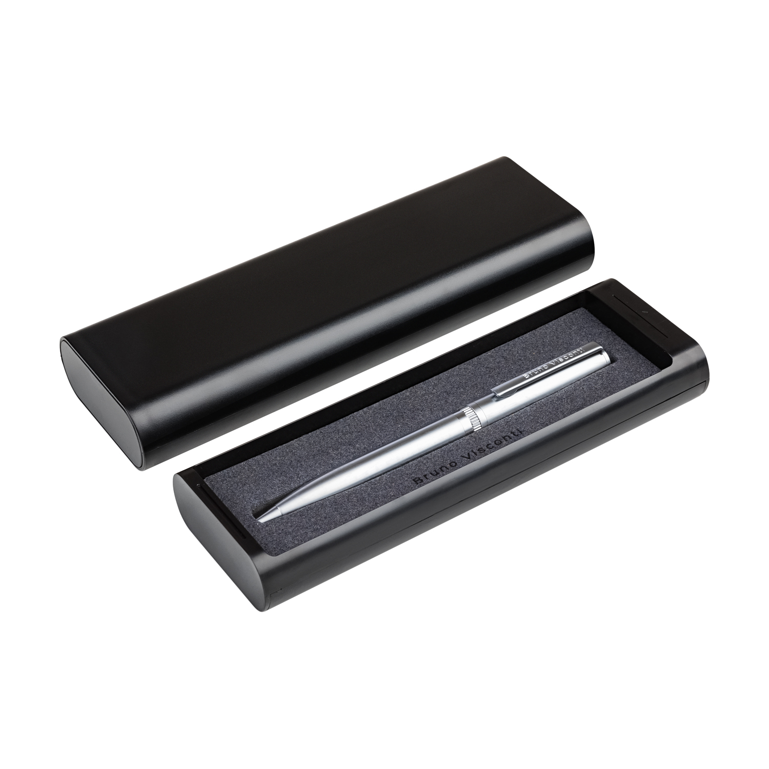 РУЧКА "BOSTON" В ФУТЛЯРЕ-СЛАЙДЕРЕ, 0.7 ММ, СИНЯЯ (корпус серебряный, футляр черный)